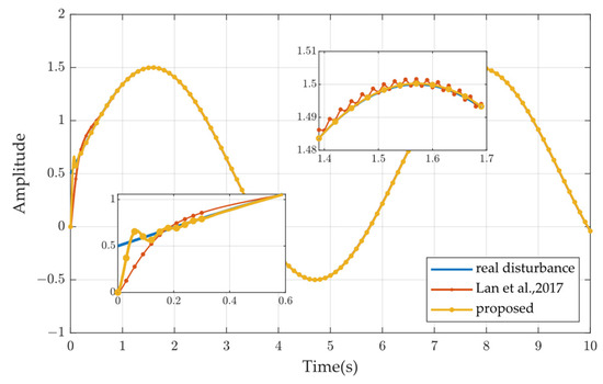 Figure 9 represents the results of different observers for the disturbance. In the initial stage of the simulation, the observer of the study [46] shows an extremely sharp change, especially in Figure 9b, the observer result changes abruptly from the initial zero to about 420 , and then gradually converges; when the subsequent disturbance shows a large sudden change, the output of the observer of the study [46] also changes abruptly, and the observation results approximate the actual disturbance in a linear relationship, and a certain degree of an overshooting phenomenon occurs. It can also be seen that, although the observation of the study [46] can quickly observe the external disturbance, there is still a small inconsistency in the observation results, which does not completely achieve the accurate estimation of the external disturbance. On the contrary, the observation results of the FDOCAM control algorithm, whether in the initial stage of the simulation, or the disturbance of a sudden change, the FDO designed in this paper does not appear to be a sudden change, and there is no overshooting phenomenon, and the observation error can be stabilized near the zero domain without chattering; although the algorithm’s disturbance observation error is exponentially convergent, the speed of convergence is not worse than that of the study [46], and in Figure 9a,c, the convergence speed of the FDOCAM is more rapid.