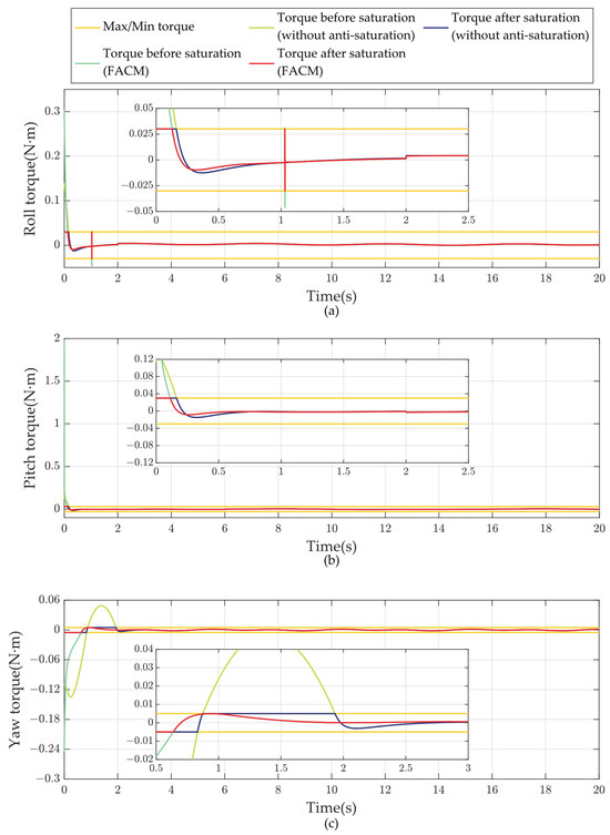 Control moment comparison result. Subplot (a–c) are the torques of the roll, pitch, and yaw channels, respectively, under different control algorithms.