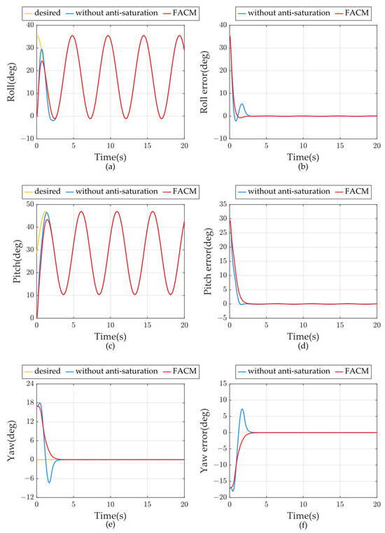 Figure 5 shows the attitude tracking results of the quadrotor UAV. In general, the attitude tracking error tends to become zero around 2.5 s with or without the anti-saturation auxiliary system in the case of known disturbance, so both control methods achieve good attitude tracking results. At the beginning of the simulation, the errors of both control methods are larger before 2.5 s because the initial attitude angle is not consistent with the desired attitude. In the 0~2.5 s interval, when there is no anti-saturation auxiliary system, both the roll channel and the pitch channel can keep up with the desired attitude faster, while the FACM algorithm designed in this paper lags slightly; in the yaw channel, when there is no anti-saturation auxiliary system, it has a larger overshooting amount although it has a shorter rise time; and the FACM algorithm achieves an asymptotic convergence of the yaw angle, and the regulation of the yaw angle is slightly slower, but it is also in the range of 2.5 s. The FACM algorithm achieves an asymptotic convergence of the yaw angle, and the adjustment time is a little slower, but it also makes the tracking error converge to zero in about 2.5 s. The reason for this phenomenon is that, at the beginning, due to the existence of a large error, the control moment reaches the saturation state, as can be seen from Figure 4, and for the algorithm without the anti-saturation auxiliary controller, the control volume is in the saturation state for a longer time, and the time of the maximum torque effect is also longer, so that it can track the desired attitude faster, but at this point, there is also a consequent overshooting, and the overshooting volume of the roll channel and yaw channel is especially obvious; on the contrary, in the FACM algorithm, due to the introduction of the anti-saturation auxiliary system based on the control algorithm, when the saturation phenomenon occurs, the auxiliary states of the anti-saturation system are changed, which reduce the angular tracking error, and thus shorten the time of the control moment in the saturated state, and the time of the maximum torque action is even shorter, so the FACM algorithm cannot track the desired attitude very quickly in the initial stage.