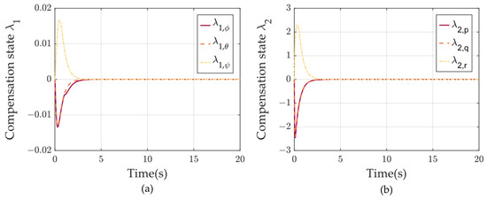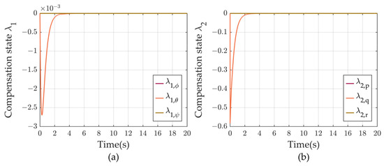Anti-saturation auxiliary system compensation states change results with disturbance observer. (a) denotes the amount of compensation state . (b) denotes the amount of compensation state .