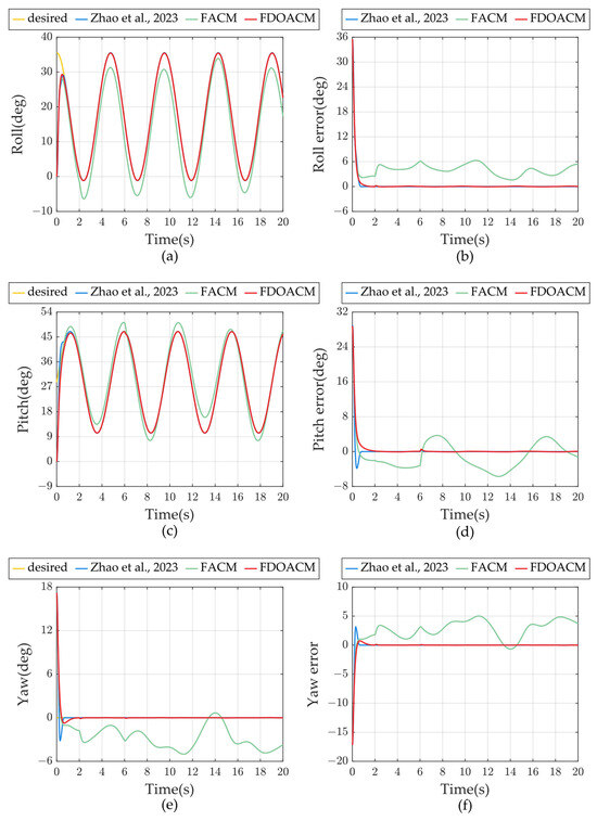 Attitude tracking results in comparison. (a,b) denote the attitude tracking results and tracking errors of the roll channel. (c,d) denote the attitude tracking results and tracking errors of the pitch channel. (e,f) denote the attitude tracking results and tracking errors of the yaw channel.