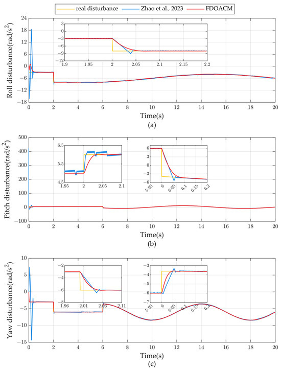 Comparison of observations with literature [46]. (a–c) denote the disturbance estimation results of the two algorithms for the roll, pitch, and yaw channels, respectively.