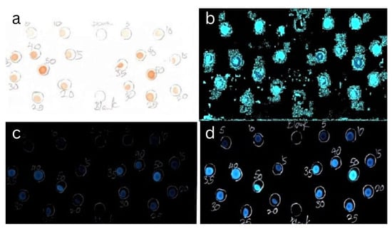Although image processing methodology from the literature was followed (where paper was the substrate) [21,40], results obtained in this study showed that settings on the software must be tailored to the specific substrate. Settings used for paper substrate were not suitable for silica substrate. Figure 2 shows the results of the silica plate with color thresholding, completed following procedures by Mentele et al. [21]. Contrary to when paper is used, it was observed that this method leads to high background noise and is not suitable for silica substrate (Figure 2b). A better image was obtained from manually adjusting the color contrast (Figure 2c) with much of the background noise eliminated. The best image resulted from setting the color contrast to “Auto”, i.e., allowing the software to correct the color contrast and then optimizing it (Figure 2d). Using this setting, the background noise was successfully reduced. This was true for both inverted and un-inverted images. The background color intensity was measured against the set concentration of zero as a blank was established. In the inverted images, the typically orange complex appeared as a luminescent blue against a black background.