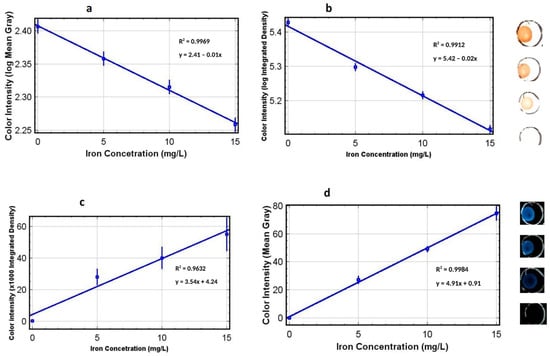 Calibration curves of Fe using the silica-based device showing: (a) color intensity of un-inverted images of detection points measured in mean gray; (b) color intensity of un-inverted images of detection points measured in integrated density; (c) color intensity of inverted images of detection points measured in mean gray; and (d) color intensity of inverted images of detection points measured in integrated density.