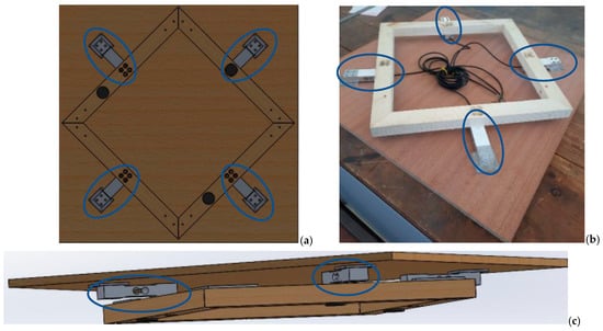 A specific platform, 80 × 80 cm with a thickness of 15 cm, was proposed by the authors. This specific platform is an extensometric load platform that has, between the plates, load sensors (load cells, of single-point type, with electrical sensitivity of 1.0 (±0.1) mV/V) based on strain gauges, which provide electrical signals relative to the applied loads. The top plate of the load platform must have the maximum possible rigidity combined with the minimum mass. The high rigidity required aims to reduce the bending of the surface during the use of the platform, guaranteeing a practically total transmission of the effort received on the surface to the force sensors. Plywood was used for the top plate of the platform since gymnastics practicable in normal practice are also made up of plates of this material (Figure 2). For this, four single-point load cells were used (Figure 3). The load cells were fixed with four screws in the top plate and in the base.