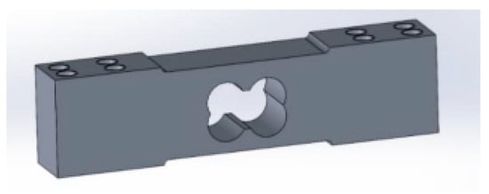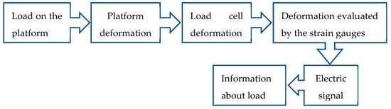 Data collection from this specific platform was carried out using PicoScope 6 software and a digital oscilloscope, with the platform system connected to the four cells of the load/oscilloscope on a Vishay Measurements Group strain gauge bridge, the SB-10 Switch and Balance Unit, Model: SB-10. With this specific platform, it is possible to quantify the vertical load of ground reaction developed during landing, which can be compared with that obtained by the commercial platform. The load exerted on the platform creates a deformation in the plate that is transmitted to the load cell. This deformation creates a voltage variation, which is interpreted by strain gauges, generating an electrical voltage level corresponding to the load. The operation of a load cell on a load platform is schematized in Figure 4.