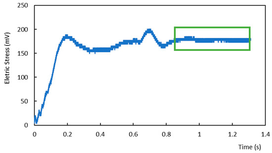 For the calibration of the proposed platform, the load cells were initially calibrated individually. After that, the calibration was performed considering the four cells of the platform. For this calibration, known weights were used. The time interval for which the signal obtained was constant was analyzed (Figure 5) and represents the stabilization of the platform. According to the calibration results, it was concluded that 1 mV corresponds to 3.50 N of load.