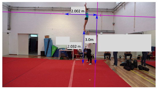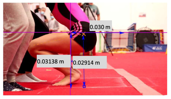 Before the jumps were performed, the cameras were calibrated and positioned relative to the platform position allowing the initial jump calibration data to be obtained. The objective of camera C1 was to obtain the maximum height of the jump (Figure 7), and the main goal of camera C2 was to obtain images of the maximum flexion of the knees of the gymnasts (Figure 8) and to characterize the landing. The foot position at landing (first image of ground contact) of the gymnasts (on the forefoot, midfoot, or rearfoot) was evaluated (Figure 9). The way landing is performed, mainly by the lower limb joints, can have a direct influence on a greater or lesser predisposition to injury occurrence. It was considered that the maximum flexion of the knees occurred when the position of the greater trochanter was the closest to the ground (Figure 8). Tracker software (Open Source Physics—Video Analysis and Modeling Tool—5.1.5) was used to extract the values of the maximum height of the jumps, using the gymnast’s heel as a reference, and also the distance of the greater trochanter to the ground. The calibration was performed according to the software instructions and using a reference rectangle (3 × 2 m) aligned with the sagittal plane of motion. The method of Direct Linear Transformation (DLT) allowed the transformation of 2D virtual coordinates to real coordinates.