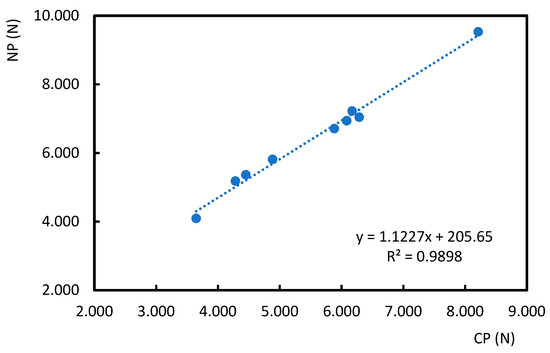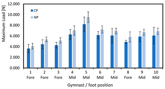 Figure 12 presents the maximum vertical load for each platform (CP—commercial platform; NP—new specific platform, in-house-built) by gymnast (n = 10) considering the position of the foot on landing. Table 4 shows the comparison between the maximum vertical load obtained by both platforms and the gymnast’s weight, according to Equation (1). Figure 13 shows the linear relationship between the load obtained for the two platforms.