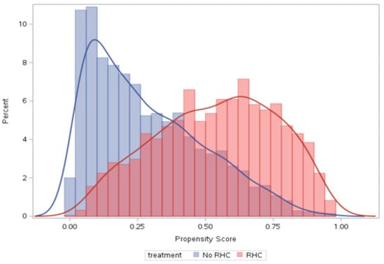 All the covariates (~50) are included, as suggested by Connors et al. [70]. The logistic regression is used to determine the PS, i.e., the probability of receiving RHC for each subject. The effectiveness of using PS to account for major covariates’ imbalance is tested for differences between the two RHD groups (with and without RHC).