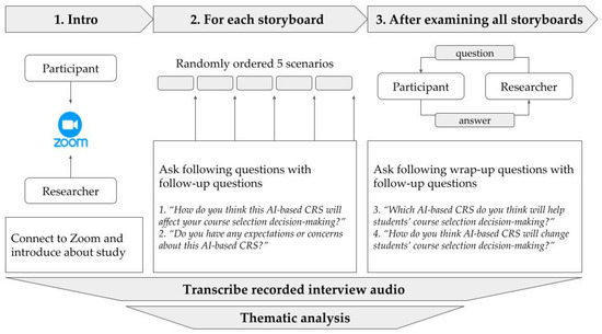 Figure 2 illustrates the comprehensive process of our experiment. We conducted semi-structured interviews with participants through a video conferencing platform (i.e., Zoom). We briefly introduced the purpose of this study and started speed dating activity using storyboards. We showed participants each storyboard in random order. The storyboard describes possible interaction where an AI-based CRS supports a student’s course-selection decision. This setup allowed participants to indirectly experience how five distinct types of AI-based CRSs facilitate decision-making. After participants read each storyboard aloud, we asked the following questions to investigate their thoughts on specific AI-based CRS represented in individual storyboards: “How do you think this AI-based CRS will affect your course-selection decision-making?” and “Do you have any expectations or concerns about this AI-based CRS?” After participants reviewed all five storyboards, wrap-up questions were asked to find out general expectations for AI-based CRSs: “Which AI-based CRS do you think will help students’ course-selection decision-making?” and “How do you think AI-based CRS will change students’ course-selection decision-making?” All the questions were open-ended. Furthermore, we asked follow-up questions such as “Why did you think this scenario would help your course-selection decision-making?” after initial responses were given. These probing questions aimed to deepen participant engagement and elicit more detailed insights. The entire interview lasted around 30.1 min (SD = 6.9 min), with 4–6 min spent sharing each storyboard and probing participants on its specific implications.