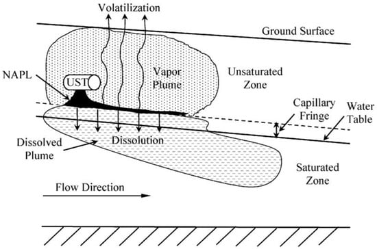 Despite numerous studies and years of research into hydrocarbon migration, the process remains in the discovery phase. When hydrocarbons enter an aquifer, they move downward under gravity through a vadose zone and partition into subsequent phases [,,,]: