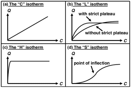 The sorption and retardation of pollutants can be estimated by laboratory experiments in which contaminated water is mixed with aquifer materials containing different amounts of adsorbents. The sorption capacity of these materials is analysed by equilibrating known quantities of a solid with solutions of the compound in question. A diagram showing the relationship between the amount of sorbed compound per unit mass of solid and the concentration in the solution phase under equilibrium conditions is called an isotherm []. Sorption isotherms often exhibit non-linear behaviours (Figure 6). A comprehensive classification is provided in the works of Giles et al. [,] and Voice and Weber []. Some models, such as Langmuir [], BET (Brunauer–Emmett–Teller []), and Gibbs, may not be suitable for describing sorption in the water phase. Therefore, only Freundlich and linear models appear suitable for characterizing pollutant reabsorption in the aqueous environment [,]. Given that the sorption process can also immobilize microorganisms (forming biofilms), isotherms can also be utilized to simulate the movement and attachment of microbes to soil particles. For simplicity, microorganism sorption is assumed to be linear. Detailed findings regarding microorganism sorption in porous media are available in the works of Mills [], Aal et al. [], and related references. Conversely, organic pollutants may be sorbed by various biological materials in a process termed biosorption [,].