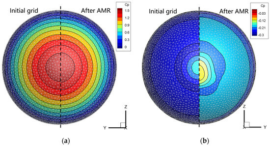 - For the three-dimensional supersonic flow simulation around a sphere, the initial grid resolution was inadequate for accurately portraying the features of the flow field. Through six iterations of solution adaptation, the accuracy in capturing shock waves was significantly improved, particularly at the front and rear of the sphere. Although this process had a minimal impact on the pressure distribution in the stagnation region, it notably improved the prediction of the separation zone, avoiding the overestimation of negative pressure regions, and thus, making the predictions of drag coefficients closer to experimental results.