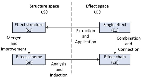 The action mechanism of effect explained by the C–K theory is shown in Figure 1. It includes effect space (E) and structure space (S). There are four propositions (E1, En, S1, and Sn) in the space, and four operators between propositions (E1→S1, S1→Sn, E1→En, and Sn→En). E1 stands for single effect knowledge. According to the source discipline of effects, effects can be divided into physical effects, chemical effects, geometric effects, and biological effects [20,21]. Physical effects, such as superplastic effect, are most frequently used in thermophysics. The grain structure of metal alloys has displacement, and the interatomic gravity at the displacement is weaker than that at the order. If there is enough displacement at the boundary between grains, only a small mechanical force can cause the sliding between grains, which is macroscopically manifested as deformation. In the production process of parts required by the aviation industry, tubular alloy steel needs to be deformed by gas pressure in different directions at the same time. However, ordinary hot molding cannot reach this pressure value. At this time, the raw materials can be put into a heating furnace with the appropriate pressure and temperature, and hollow parts can be made by using the superplastic effect. In order to facilitate the collection and retrieval of effects, existing research teams have established special effect libraries, including physical effect libraries, namely Oxford Creativity and Production Inspiration, and biological effect libraries, namely Biology Online and AskNature [22]. These effect libraries help the use of effects, but further development is necessary for the improvement.