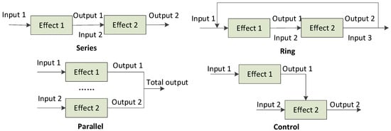 For a complete effect chain, En, design knowledge contained in a single effect is limited. Increasing the number of effects applied at the same time is required for complex product functions. For example, the bimetallic circuit breaker is based on Hooke’s law and the thermal expansion effect. A plurality of causal effects can be connected with the following four effect modes [23] in the form of a circuit, as shown in Figure 2.