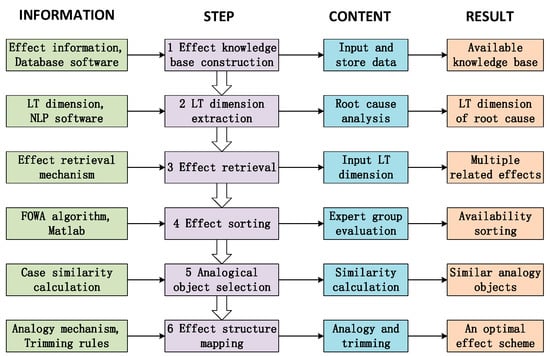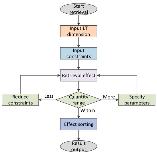 With the help of the close relationship established by the LT-PES model, the effect retrieval mechanism based on the LT dimension is formed, as shown in Figure 4, using the following five steps. (1) The LT dimension is input into the effect knowledge base. The LT dimension comes from the NLP extraction result of the root cause of the problem. Because of the abstraction of the LT dimension, one LT dimension mostly corresponds to multiple physical quantities for query expansion [82]. (2) Constraints are applied for more applicable results. It also reduces the interference of irrelevant content. Specific constraints come from the problem part, effect part, and structure part of the model, such as design constraints, industry, and available resources. (3) The retrieval link obtains the qualified effect information from the established effect knowledge base. (4) The number of retrieval results is decided. Effect knowledge can be treated as an information block for processing, following Miller’s law in product design, which limits the number of effect searches from five to nine. A small number is not enough to support the divergence of design thinking. We can gradually reduce restrictions and repeat the retrieval steps until the regulations are met. When the quantity is too large, the physical quantity parameters involved can be further defined in limiting conditions. Retrieval steps can also be repeated. (5) The math algorithm is used to rank alternative results. Finally, one or more effects with the highest availability are the design output.