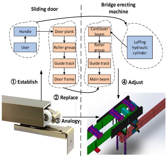 Analogy is a way of thinking and cognitive skill from known to unknown [65]. If two objects have a similar series of attributes and one object is known to have some specific attributes, it is deduced that the other object also has similar specific attributes. Analogical thinking has played an important role in the fields of scientific discovery, economic management, and intelligent learning [66]. Analogical design uses the concept of analogy to transfer the causality and structure of source design knowledge to target design in solving problems [67]. Both case-based reasoning (CBR) and bionic design are affected by the analogy design [68]. There are three significant characteristics of the analogy design, as follows: