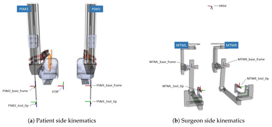 Each PSM has 6 joints following the kinematics described in [31], and an additional degree of freedom for opening and closing the gripper. The tip of the instrument moves around a remote center of motion, where the origin of the base frame of each manipulator is set. The motion of each manipulator is described by its corresponding base_frame with respect to the the common frame ECM, as shown in Figure 2a. The MTMs used to remotely teleoperate the PSMs have 7-DOF, coupled with the capability to open and close the instrument. The base frames of each manipulator are related through the common frame HRSV, as shown in Figure 2b. The transformation between the base frames and the common one in both sides of the dVRK is described in the json configuration file that can be found in the ROSMA Github repository (https://github.com/SurgicalRoboticsUMA/rosma_dataset, accessed on 26 February 2024).
