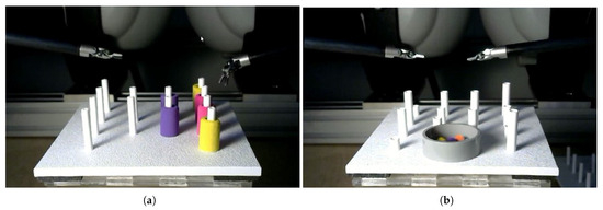 The Robotics Surgical Maneuvers (ROSMA) dataset is a large dataset collected using the platform described in the previous section. This dataset contains the performance of three tasks of the Skill-Building Task Set (from 3-D Technical Services, Franklin, OH, USA): post and sleeve, pea on a peg, and wire chaser. These training platforms for clinical skill development provide challenges that require motions and skills used in laparoscopic surgery, such as hand-eye coordination, bimanual dexterity, depth perception, or interaction between dominant and non-dominant hands [32]. A detailed description of these tasks is described in Section 2.3.