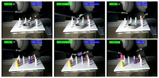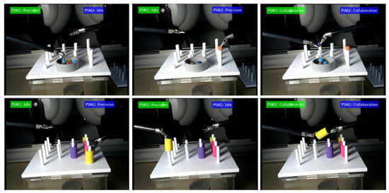 - Collaboration (G4): both instruments are collaborating on the same task. For pea on a peg, collaboration occurs when the dominant tool needs support, usually to release peas held together by static friction, so it is an intermittent and unpredictable action. For post and sleeve, collaboration is a mandatory step between picking and placing an object, in which the sleeve is passed from one tool to another.
