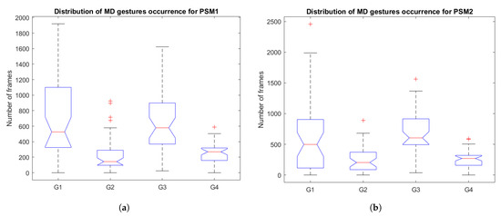 Distribution of the gestures occurrence for the MD gestures for (a) PSM1 and (b) PSM2. The red central mark on each box indicates the median, and bottom and top edges indicate the 25th and the 75th percentiles, respectively. The whiskers extend to the most extreme data points not considered outliers, and the outliers are plotted individually using the ‘+’ marker symbol.