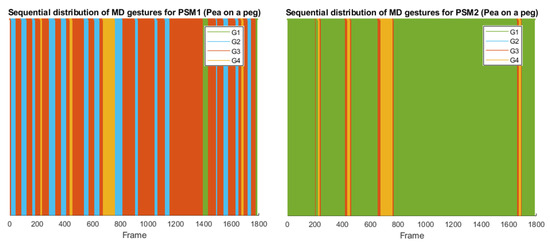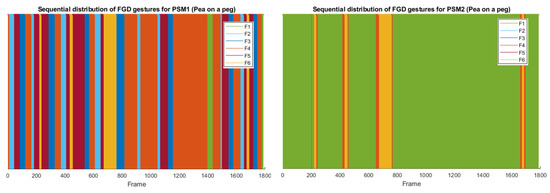 Sequential distribution of the FGD gestures along a complete trial of a pea on a peg task for PSM1 (left) and PSM2 (right).