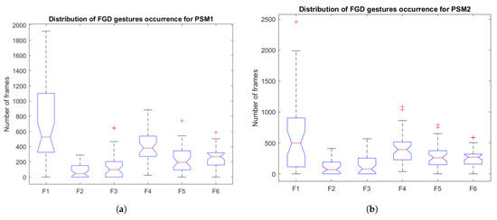 Distribution of the occurrence for the FGD gestures for (a) PSM1 and (b) PSM2. The red central mark on each box indicates the median, and bottom and top edges indicate the 25th and the 75th percentiles, respectively. The whiskers extend to the most extreme data points not considered outliers, and the outliers are plotted individually using the ‘+’ marker symbol.