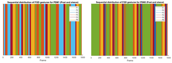 Sequential distribution of the FGD gestures along a complete trial of post and sleeve task for PSM1 (left) and PSM2 (right).