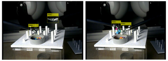 The dVRK, supported by the Intuitive Foundation (Sunnyvale, CA, USA), arose as a community effort to support research in the field of telerobotic surgery [29]. This platform is made up of hardware of the first-generation da Vinci system along with motor controllers and a software framework integrated with the Robot Operating System (ROS) [30]. There are over thirty dVRK platforms distributed in ten countries around the world. In this work, we have used the dVRK platform located at The Biorobotics Institute of the Scuola Superiore Sant’Anna (Pisa, Itally). This platform has two Patient Side Manipulators (PSM), labelled as PSM1 and PSM2 (Figure 1a), and a master console consisting of two Master Tool Manipulators (MTM), labelled as MTML and MTMR (Figure 1b). MTMR controls PSM1, while MTML controls PSM2. For the experiments described in this paper, the stereo vision is provided using two commercial webcams, as the dVRK used for the experiments was not equipped with the endoscopic camera manipulator.
