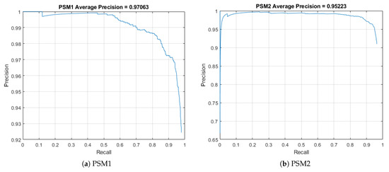 Table 13 shows the experimental results for the LOSO experimental setup. Both models have high-precision results for the detection of both tools, reaching over 80% mAP. This reveals the generalization capabilities of the YOLOv4 network to detect the instruments in a scenario the network has not seen before. On the other hand, Table 14 presents the experimental results for the LOTO experimental setup. As expected, results when the network has seen both task scenarios during the training are higher, reaching values of 97.06% and 95.22% mAP for PSM1 and PSM2, respectively. Comparison between the performance using CSPDarket53 and YOLOv4-tiny shows that the tiny version provides similar accuracy results but the performance is 2/3 times faster. Figure 14 shows the precision-recall curves for this model, showing both high recall and high precision for the PSMs detection.