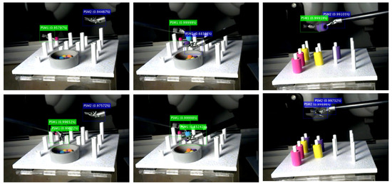 Figure 15 shows different examples of correct (top images) and incorrect (bottom images) tool detection. In this figure, we can observe two examples of how the model is able to detect and distinguish the instruments even when they cross and there is an overlap of their bounding boxes. This figure also shows the more representative situations of incorrect detections, i.e., when the network detects more than two instruments in the image, and incorrect detection when the instruments cross.