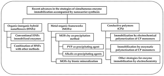 Currently, there are many strategies [24,25] for enzyme immobilization based on nanomaterials. However, most of these immobilization strategies typically involve the preparation of carrier materials for enzyme loading, followed by the physical or chemical binding of the carrier and enzyme. The preparation and separation of carriers involve multiple steps and cumbersome processes, which are time-consuming [26]. Therefore, there is a growing research interest in developing strategies that can simultaneously synthesize carrier materials and immobilize enzymes. These immobilization strategies involving nanocarriers can be rapidly synthesized through simple physical or chemical reactions, with characteristics such as easy preparation steps, mild conditions, short processing times, and minimal enzyme damage often achieving better results. In this review, we have selected three immobilization strategies that align with these characteristics, including organic–inorganic nano-flowers, metal–organic frameworks, and conductive polymers as nanocarriers for enzyme immobilization (Figure 1). We have outlined their mechanisms of action, general operational processes, key influencing factors, and post-immobilization effects. Additionally, we have briefly discussed the existing limitations and improvement directions for these three strategies. This paper aims to provide more theoretical references for the research and development of strategies that simultaneously synthesize carrier materials and immobilize enzymes during the carrier synthesis process. Due to the abundance of acronyms in this review, we have created an acronym table for better understanding (Abbreviations).