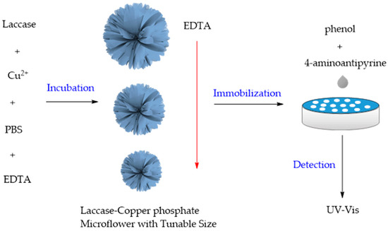 Hua and colleagues reported a method for preparing size-controlled laccase-copper phosphate composite material (Lac@Cu3(PO4)2) (Figure 3). using ethylenediaminetetraacetic acid (EDTA) as a chelating compound. Lac@Cu3(PO4)2 was employed for the rapid and sensitive detection of phenol in water, exhibiting excellent catalytic activity and reusability. In terms of activity, Lac@Cu3(PO4)2 was 7–11 times higher than free laccase [76].
