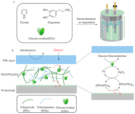 A schematic of polydopamine/polypyrrole/glucose oxidase (PDA/PPy/GOx) as a highly sensitive and stable amperometric glucose sensor. (a), One-pot chronopotentiometric co-deposition of GOx and PDA/PPy on electrodes. (b), The sensing mechanism of the PDA/PPy/GOx amperometric glucose sensor. [138].