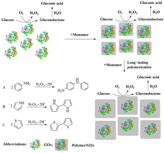German and colleagues achieved the one-step polymerization of corresponding monomers (aniline, pyrrole, and thiophene) through enzyme-catalyzed polymerization, forming nanoparticles PANI/GOx, PPy/GOx, and PTh/GOx [150] (Figure 7). Additionally, Ramanavicius and collaborators immobilized GOx within PPy, enhancing the stability of GOx [132].