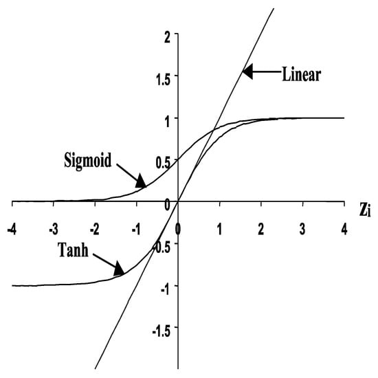 Starting from the input layer, the network elements propagate the signals from layer to layer until the outputs are generated by the output layer. Various activation functions, including linear, sigmoid and tangent (Figure 2), are applied to generate the outputs of the neurons in the hidden layer and the outputs of the neurons in the output layer.