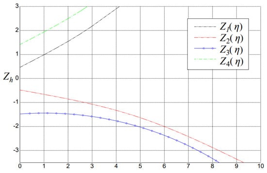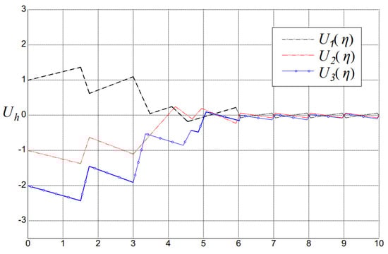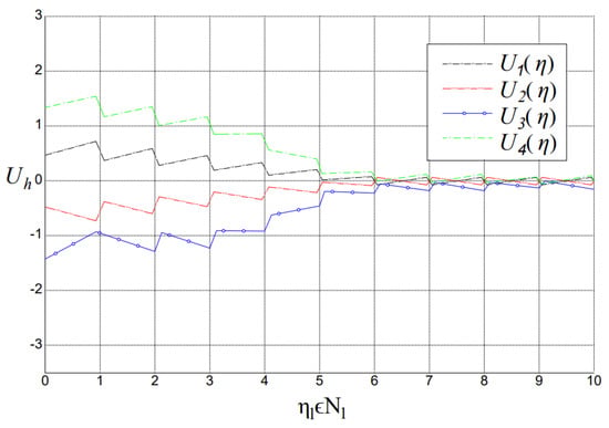 where n is the number of elements in the neural network model (1), is the state of the input j at the discrete time t, , are the connection weights, are the activation functions corresponding to different neurons j, and is the external bias of the neuron h. The generalized model (1) takes into account the ability to consider different activation functions for different neurons. Moreover, constants are added to consider the possibility of the neuron h resetting its potential to the resting state when isolated from other nodes and inputs.