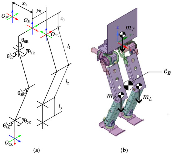 Humanoid robots have a similar joint structure to humans and are expected to perform actions usually performed by them. Robots with human-like mobility that do not require changes in work environments in the industry, space, service, and health sectors can increase the quality of life of people. Humanoid robots have advanced enough for use in industrial settings [1,2,3]. These robots mainly consist of a bottom part, which consists of two legs connected to the pelvis that carry the trunk and is responsible for locomotion, and an upper body, which is connected to two arms and contains a central computer, sensors, and a power supply, to perform the tasks assigned to the robot. This study focuses on the locomotion of the bottom part, consisting of two legs and a pelvis piece.