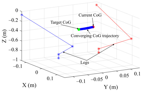 For the precise calculation of the CoG, joint angles are first calculated using the current positions. Using these angles, the CoG of the robot is calculated using Equation (19). The vector from the current to the reference CoG is found using Equation (20).