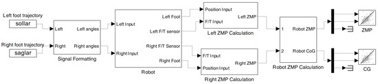 The joint angles of the left and right legs are input to the model. The model applies trajectories to the robot. ZMP and CoG are calculated in the model. Since the floor is flat and the CoG height of the robot is constant in the simulation, only the x and y components of the ZMP and CoG are plotted.
