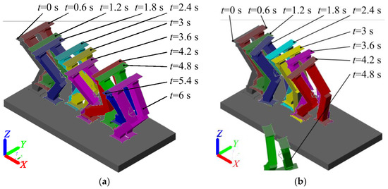 The timespan of the simulation is divided into 10 equal intervals, as shown in both Figure 7a,b. A screenshot of the simulation is taken and overlaid on the previous moment at the start of the intervals. The leftmost pose is the starting pose of the simulation in each panel in Figure 7. The robot moves forward in the positive x direction, which is represented by the red arrow in Figure 7.