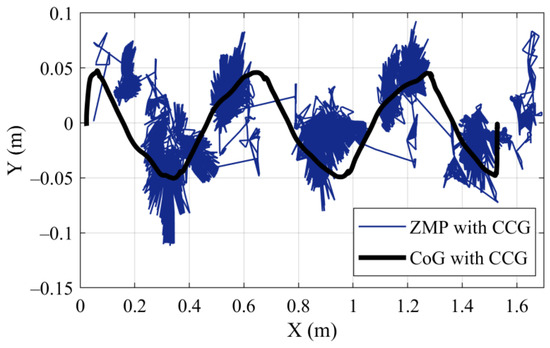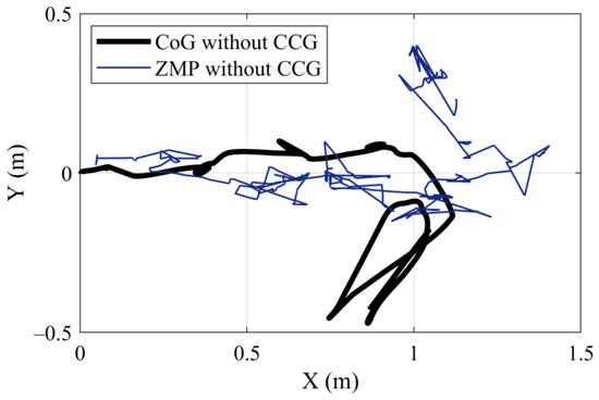 On the other hand, in the result of the simulation run without CCG in Figure 10, the CoG and ZMP values are compatible during the first two steps but deviate afterwards, and the trajectory showing the robot fall is seen in the fourth step as a result of the disruption of this compatibility in the third step.