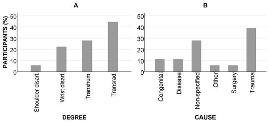 Bar plots illustrating the responses to the following: (A) the degree of amputation or congenital disorder and (B) the cause of amputation.