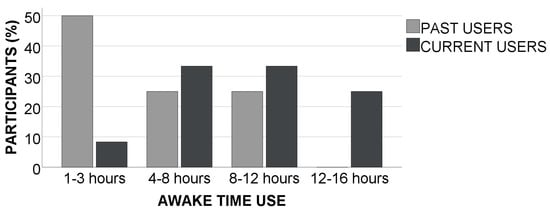 Prosthetic use frequency seems to be correlated with the user group (see Figure 2). Twenty-five percent of current users wear prosthetics all day long (12–16 h), while no past users reported wearing it for this duration. The reported mean usage time was 8.95 h, which aligns with previous studies [43]. Prosthetic use frequency for past users was generally lower, with 50% of them wearing prosthetics for only 1–3 h per day.