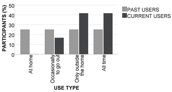 The reported use type also appears to be associated with the user group (see Figure 3). Approximately 41.67% of current users reported using their prosthesis for almost everything, while this rate was only 25% for past users. Similarly, 25% of past users reported only using the prostheses at home, which is a pattern that was not reported by any current users.