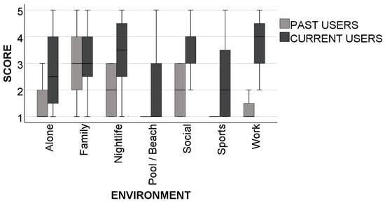 Box-and-whisker plot detailing prosthetic use frequency reported by past and current users in certain environments, where 1 = never and 5 = always.