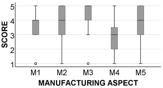 A box-and-whisker plot illustrating the score obtained for each aspect related to the socket manufacturing process, where 1 = strongly disagree and 5 = strongly agree. The statements are labeled as detailed in Table 2.