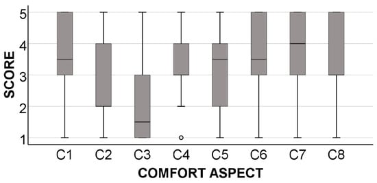 A box-and-whisker plot representing the score obtained for each aspect related to socket comfort, where 1 = strongly disagree and 5 = strongly agree. The statements are labeled as detailed in Table 3.
