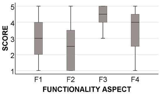 A box-and-whisker plot representing the score obtained for each assessed functionality aspect, where 1 = strongly disagree and 5 = strongly agree. The statements are labeled as detailed in Table 4.